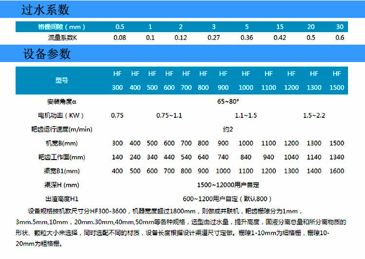 设备规格按机宽尺寸分GF300-3600型。机宽超过1800mm,则做成并联机,中间部分共用墙板。耙齿栅隙分为1mm、3mm、5mm、10mm、15mm、20mm、30mm、40mm、50mm等需要规格,选型由过水量、提升高度、固液分离总量和所分离物质的形状、颗粒大小来选择,同时选配不同的材质。